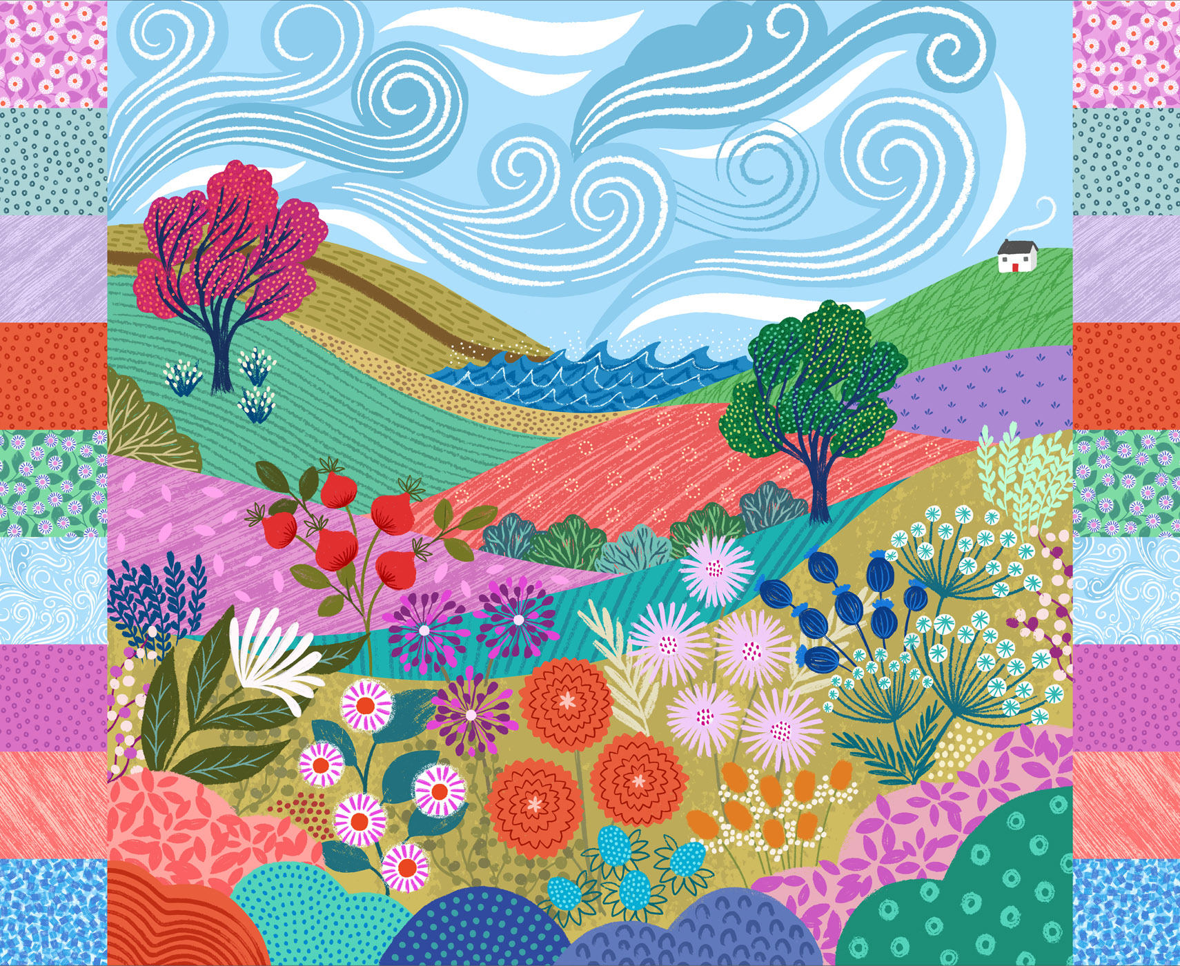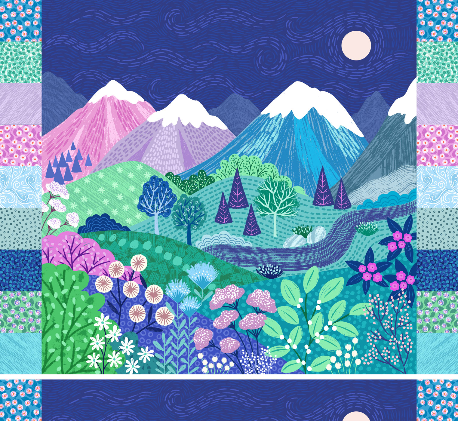 Celebrate the spirit of the great outdoors with this fabric collection. Two striking feature panels anchor the range: one portraying snow-tipped mountains with a meandering river, and the other capturing rolling hills meeting a windswept lakeshore, where grasses and water move restlessly in the breeze.