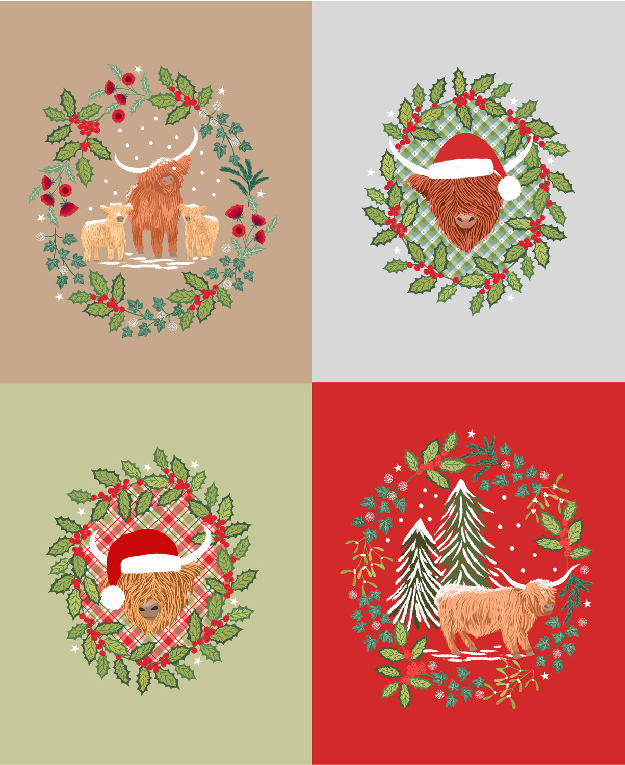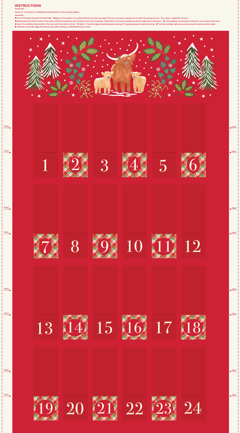 Included are beautifully detailed Christmas prints inspired by Celtic motifs, a versatile one yard panel with four unique designs – perfect for sewing projects or incorporating into quilts – and a striking double-edge border print showcasing Highland cows beneath a wintry sky. And for an extra special touch, there’s even a Highland cow advent calendar to sew and enjoy throughout the season.