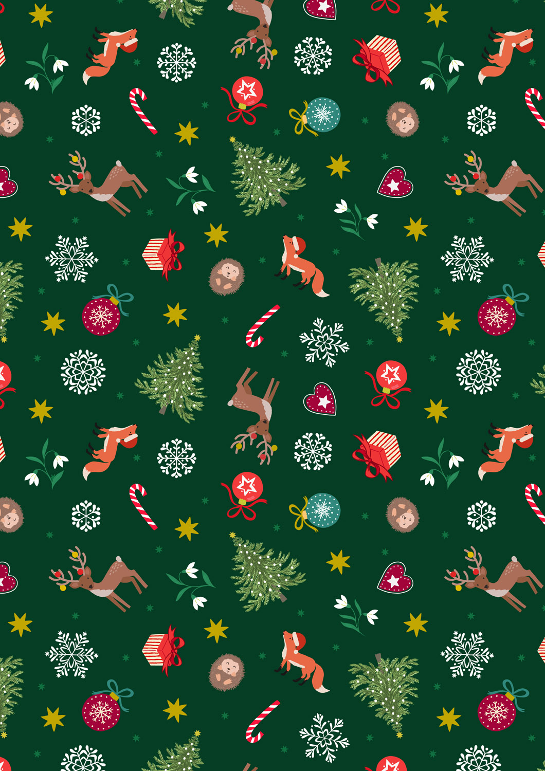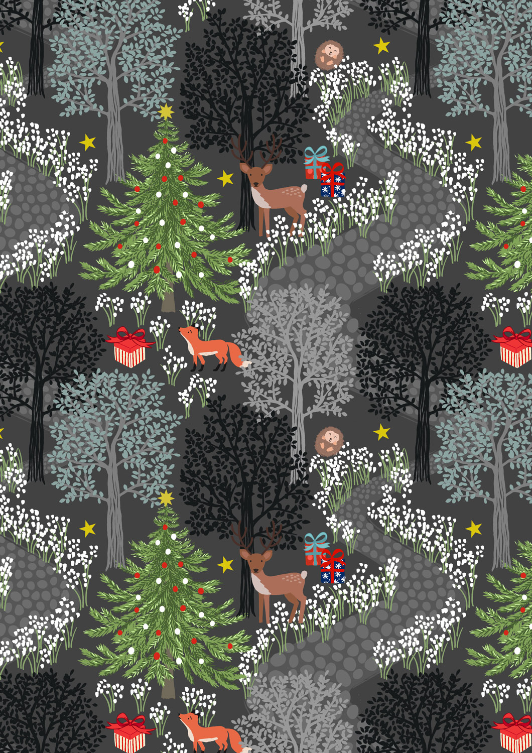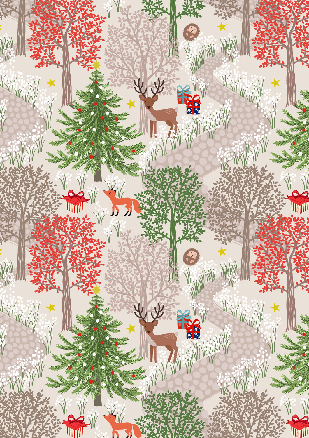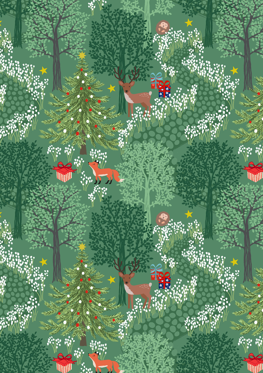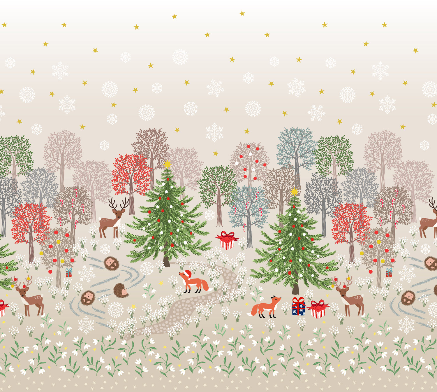 In the heart of the woods, you’ll find gentle deer, curious foxes, a cheerful hedgehog, and twinkling Christmas trees – all brought to life in our signature Bluebell Wood style. Whimsical prints of snowdrops and scattered stars accompany a playful design of hedgehogs rolling in snowflakes. A festive spruce garland print adorned with gold metallic touches that glint like leafy tinsel is a perfect nod to traditional holiday decorations.