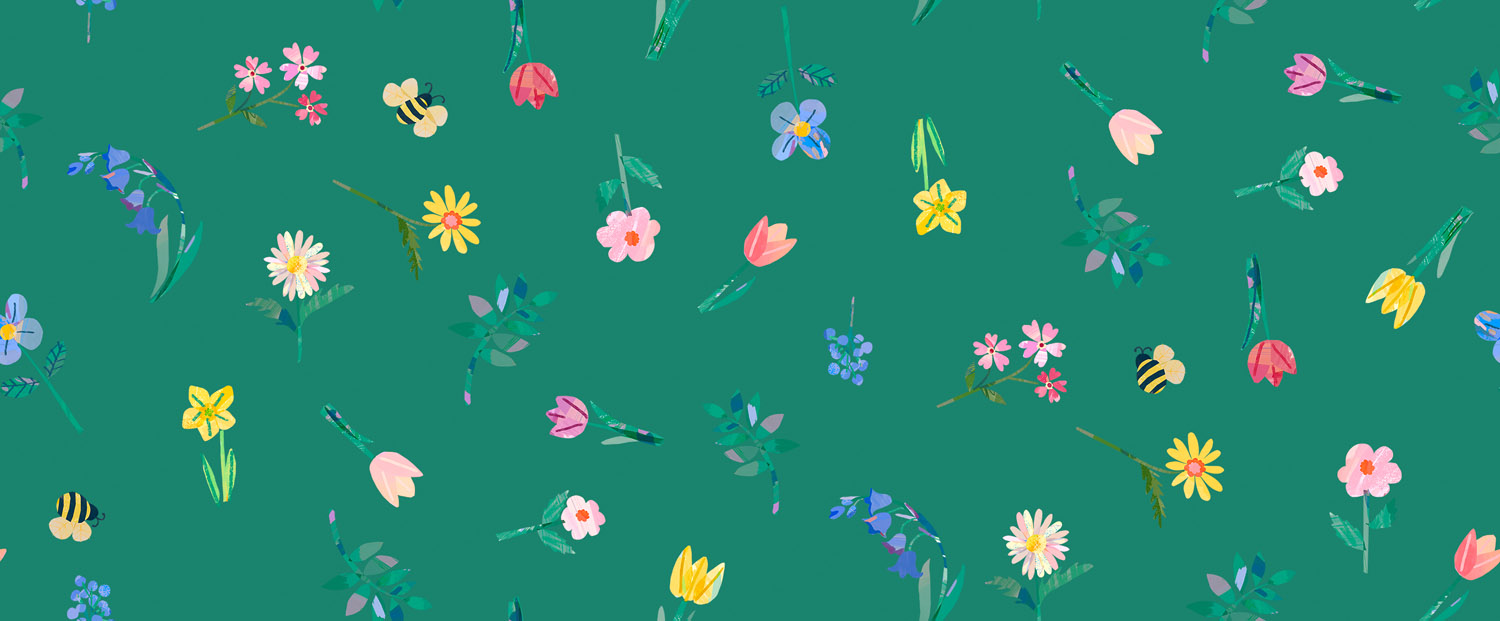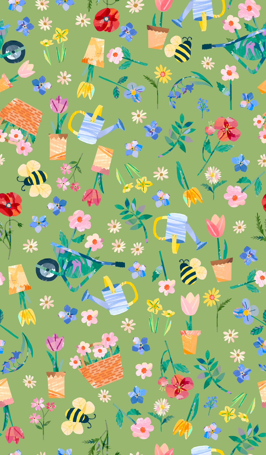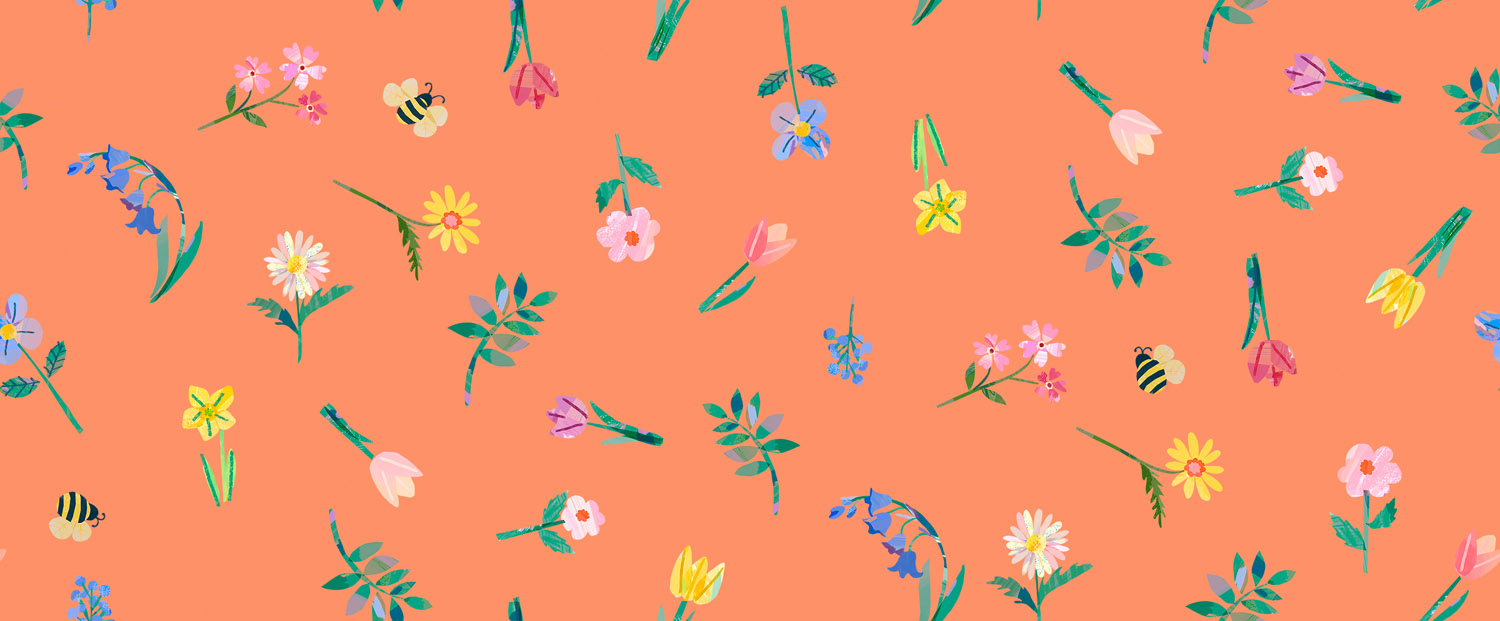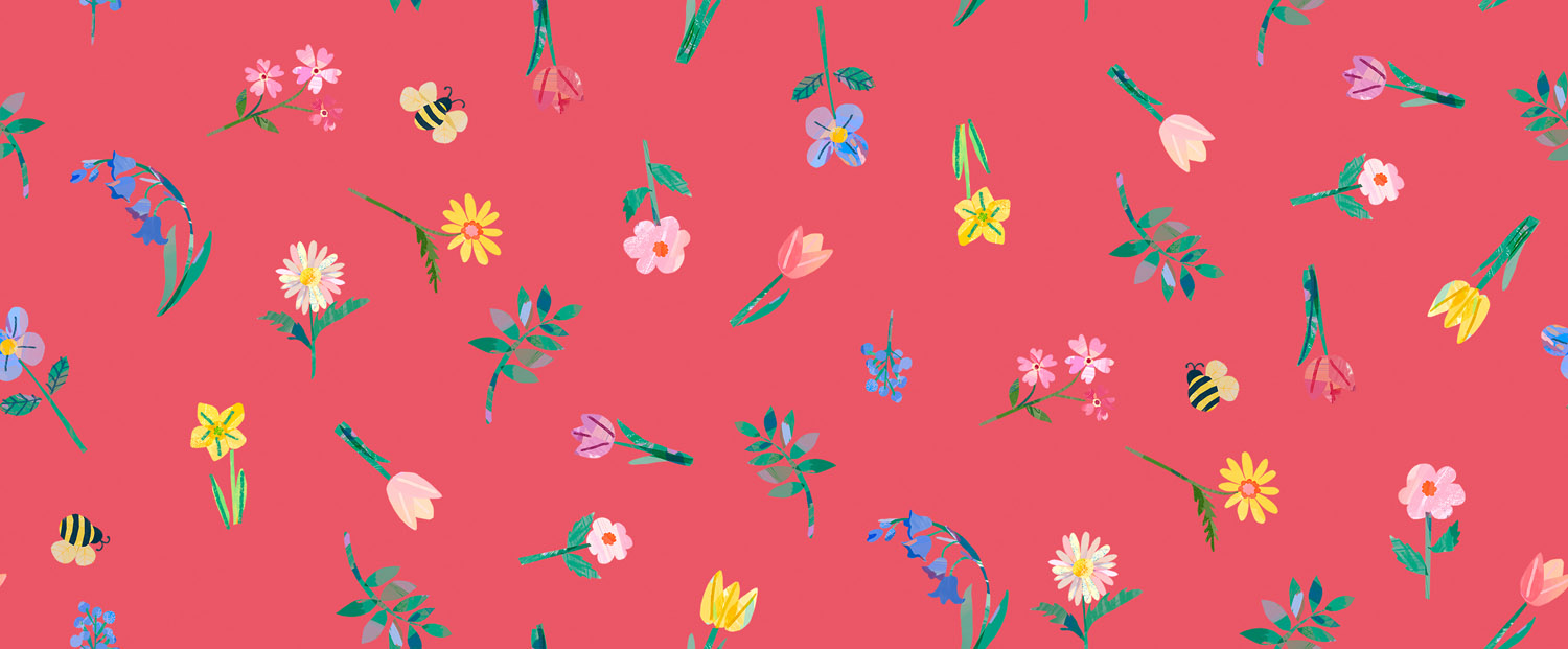 Full of charm and painterly detail,the Flower Market collection captures the whimsical spirit of a bustling spring flower stall. With bumblebees buzzing, wheelbarrows brimming with blooms, and perfectly potted tulips, each design is created using a unique handpainted collage technique, giving the collection its playful, illustrative feel.
