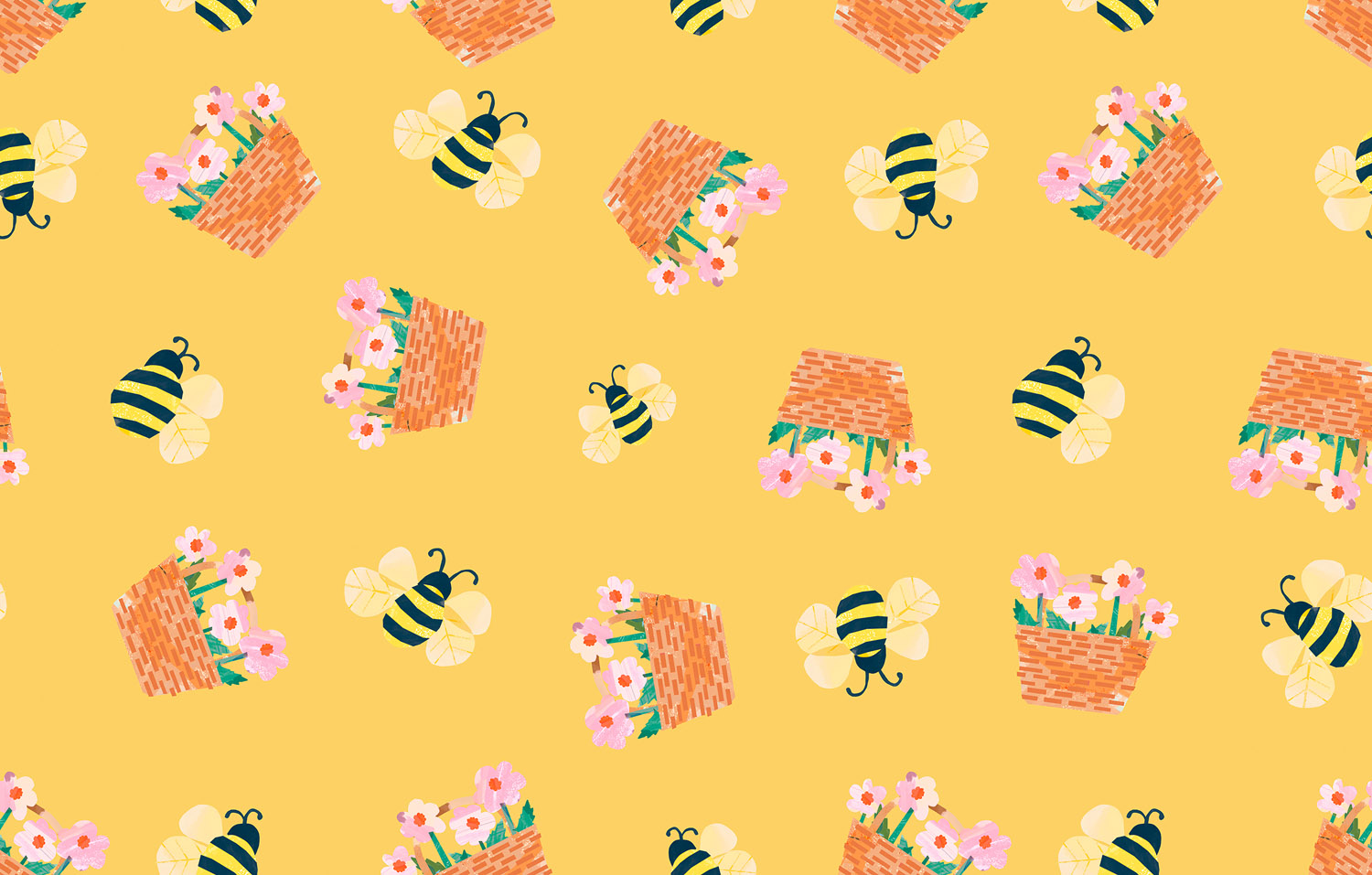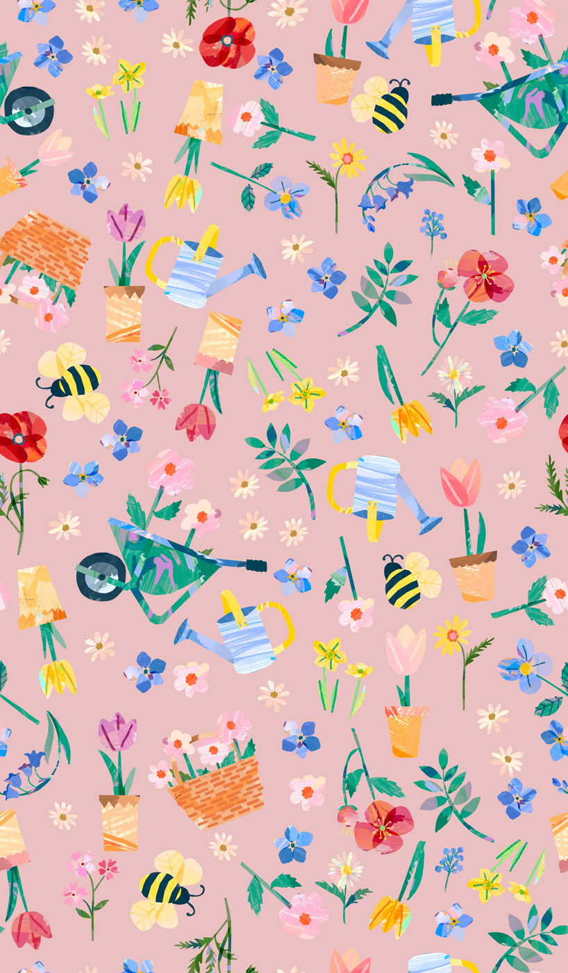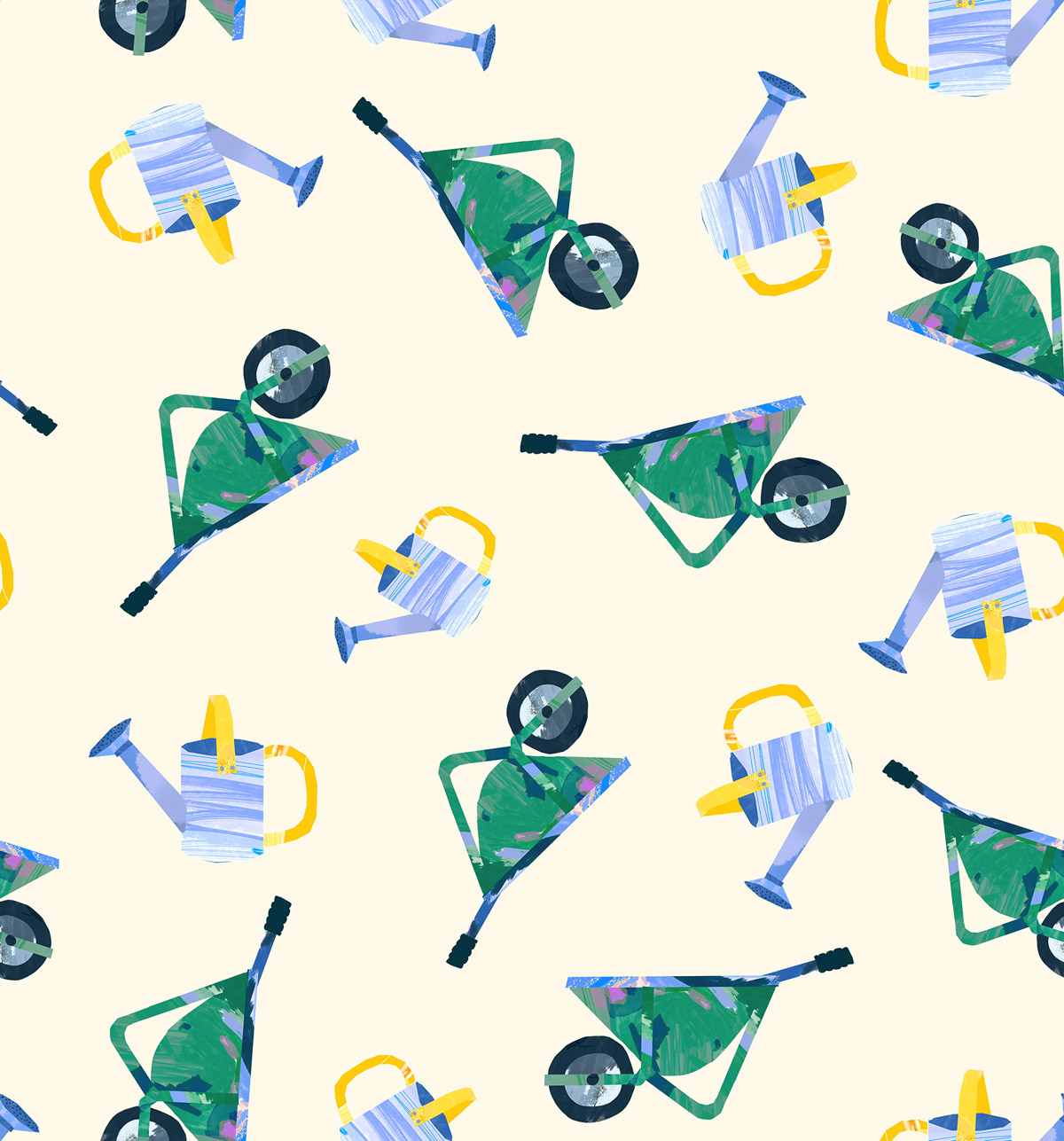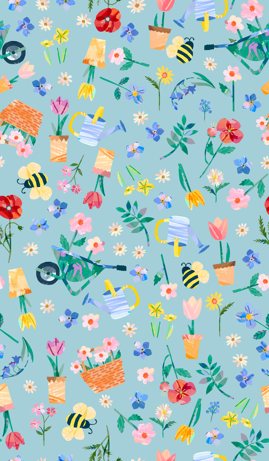 Full of charm and painterly detail,the Flower Market collection captures the whimsical spirit of a bustling spring flower stall. With bumblebees buzzing, wheelbarrows brimming with blooms, and perfectly potted tulips, each design is created using a unique handpainted collage technique, giving the collection its playful, illustrative feel.