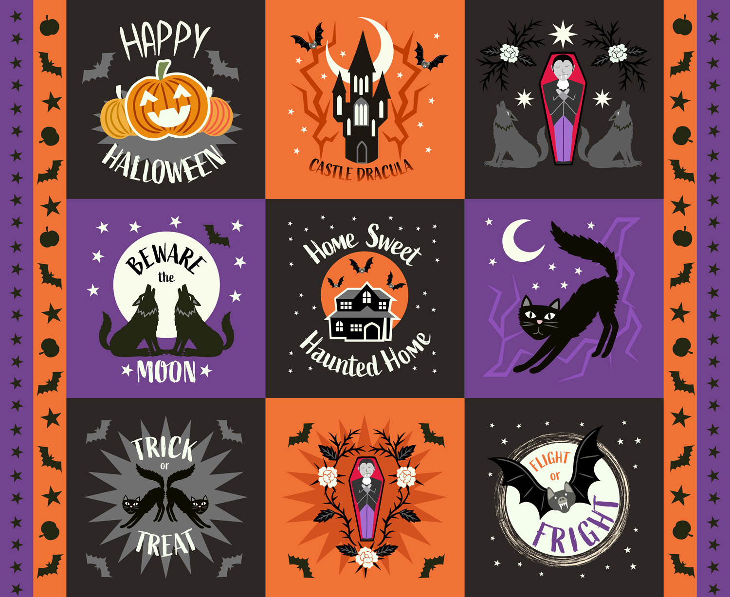 From Dracula’s eerie castle in a dramatic double edge border print to werewolves howling at a glowing full moon, these fabrics are packed with ghoulish charm. A one-yard panel of glow-in-the-dark squares showcases the full cast of creepy characters – Dracula, spooky black cats, jack-o’-lanterns, and more – perfect for quilts, treat bags, costumes, or any Halloween project your imagination dares to conjure.